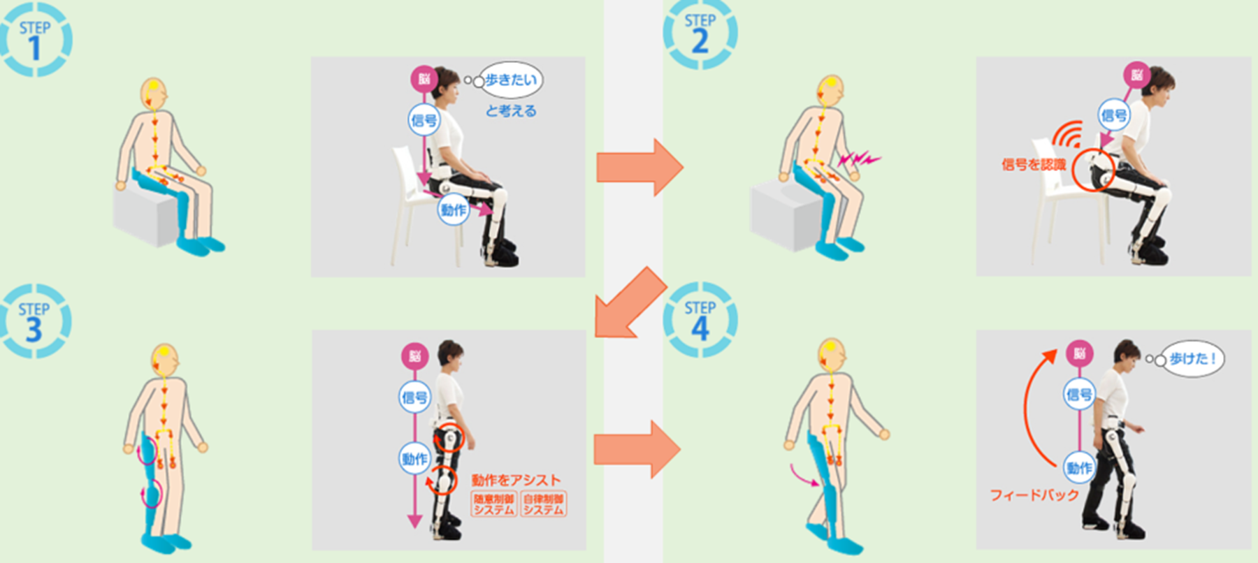 When a person tries to move his/her body, signals are transmitted from the brain to the muscles through nerves according to the person’s will to move, and at that time, weak “bioelectric potential signals” leak out onto the body surface. HAL® detects the “bioelectric potential signals” of the wearer using sensors attached to the skin and realizes movement according to the wearer’s will. Based on this principle of operation, commands are mutually fed back from the brain to the spinal cord, motor nerves, muscles, movement, sensory nerves, spinal cord, and brain. This is called interactive biofeedback, and HAL® has a feature that enables efficient motor learning.